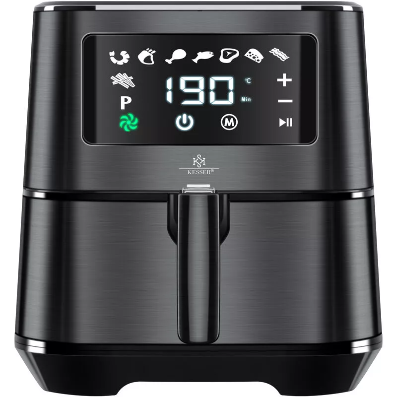 Freidora de aire caliente KESSER 1700W acero inoxidable, Incl. Temporizador, cesta para pan y asas Cool Touch, moderna pantalla táctil con indicadores LED. ¡Se hace más rápido y sabe mejor con KESSER! Con la freidora Kesser®, está eligiendo un auténtico todoterreno para su cocina. Con este aparato, se combinan varias funciones al mismo tiempo: no solo consigue hacer patatas fritas crujientes sin grasa, sino que también puede utilizarlo para cocinar, estofar o asar sus alimentos. De este modo, tendrá un solo aparato para todo y creará más espacio en su cocina. Gracias a los materiales de alta calidad y al elegante diseño, la freidora se integra perfectamente en el conjunto de cualquier cocina. Gracias a su fácil manejo y a las asas Cool Touch, toda la familia puede utilizar esta freidora de aire caliente. Gracias al revestimiento antiadherente de teflón y a la posibilidad de lavarse en el lavavajillas, la freidora también se puede limpiar en un dos por tres. Descripción del producto: •