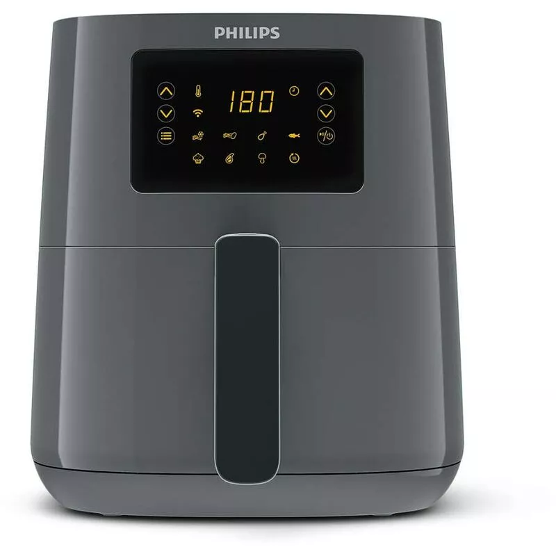Apagado automático Si Potencia 1400 W Peso 4,55 kg Ancho 264 mm Altura 295 mm Profundidad 360 mm Tipo de instalación Independiente Tipo de construcción Sencillo Longitud del cable 0,8 m Número de cestas freidoras 1 Tipo de control Tocar Partes de platos a prueba de agua Si Taza interior no adherente Si Carcasa de pared fría Si Capa antiadherente Si Mango frío al tacto Si Agarradera(s) Si Fácil de limpiar Si Interruptor de encendido/apagado integrado Si Color del producto Negro, Gris Número de programas 13 Función asar Si Función de freír Si Programas de cocción predefinidas Si Capacidad de fritura 0,8 kg Ajustes de termostato Si Capacidad 4,1 L Temporizador digital Si Tecnología de fritura baja en grasas Rapid Air Función mantener caliente Si Asado a la parrilla Si Función de horneado Si Tipo de producto Freidora de aire caliente Tipo de visualizador LED Piloto de temperatura Si Alarma lista Si Luz de indicación Si Interruptor de luz on/off Si Indicador de listo Si Pantalla